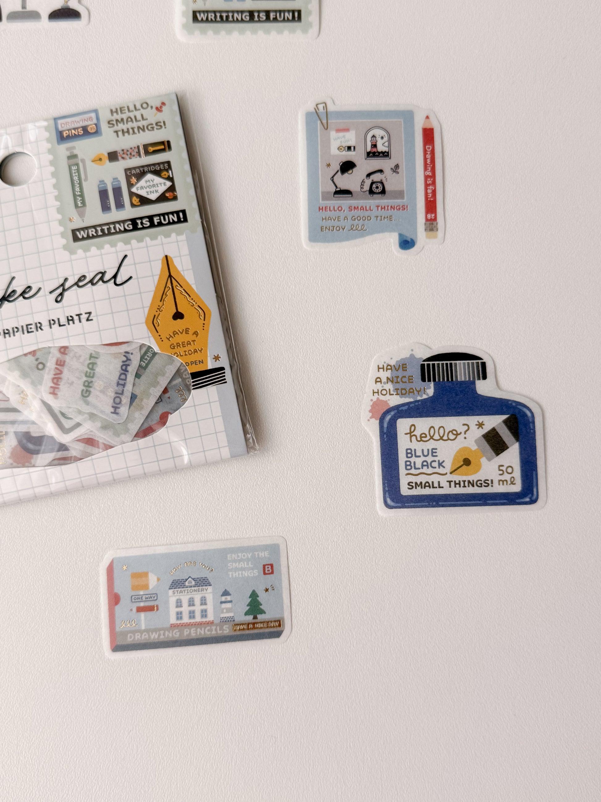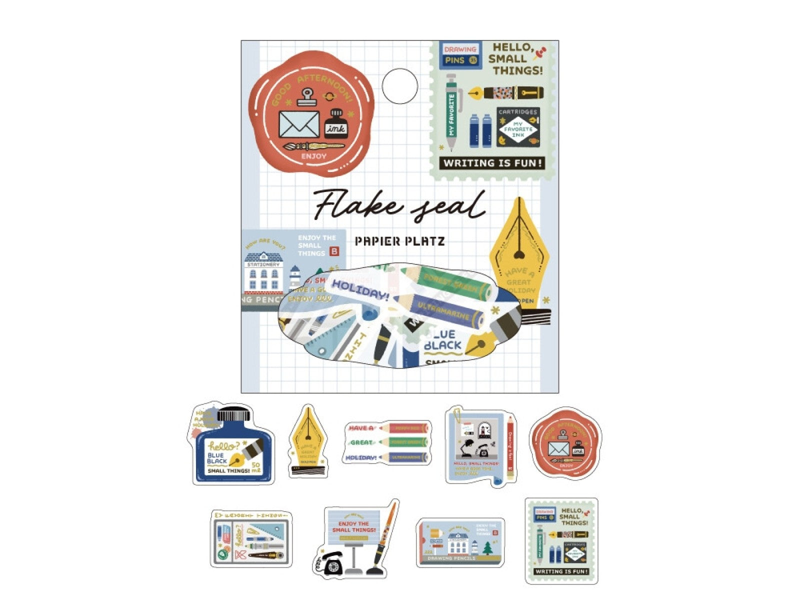 Papier Platz x Erico Matsubara's "Hello Small Things" washi sticker flakes feature gold foil details. There are 9 different designs showcasing an ink and fountain pen theme.