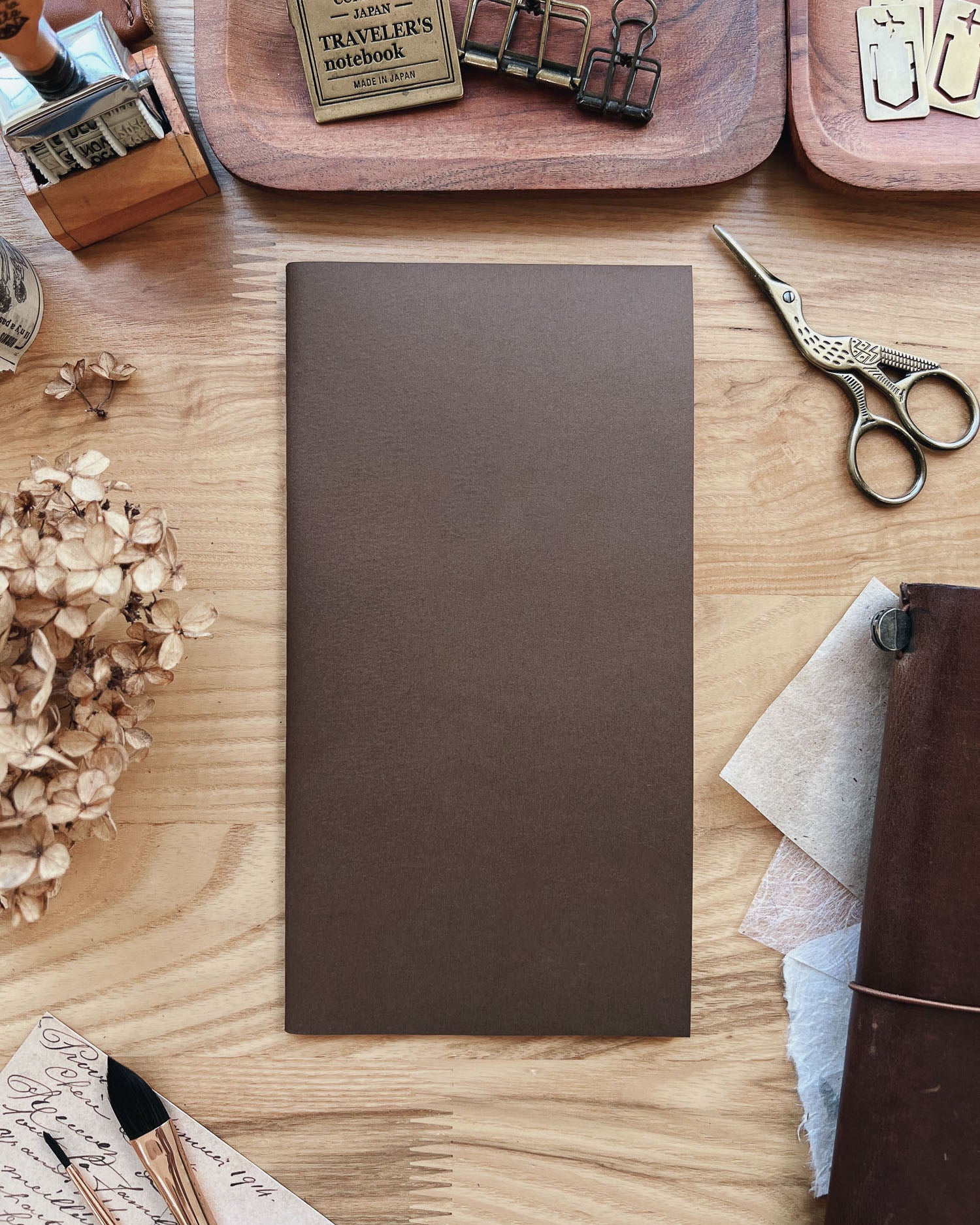 Sarica’s notebook is filled with a hundred pages of subtly gridded Tomoe River Paper. Fits perfectly in a standard Traveler’s Notebook cover.