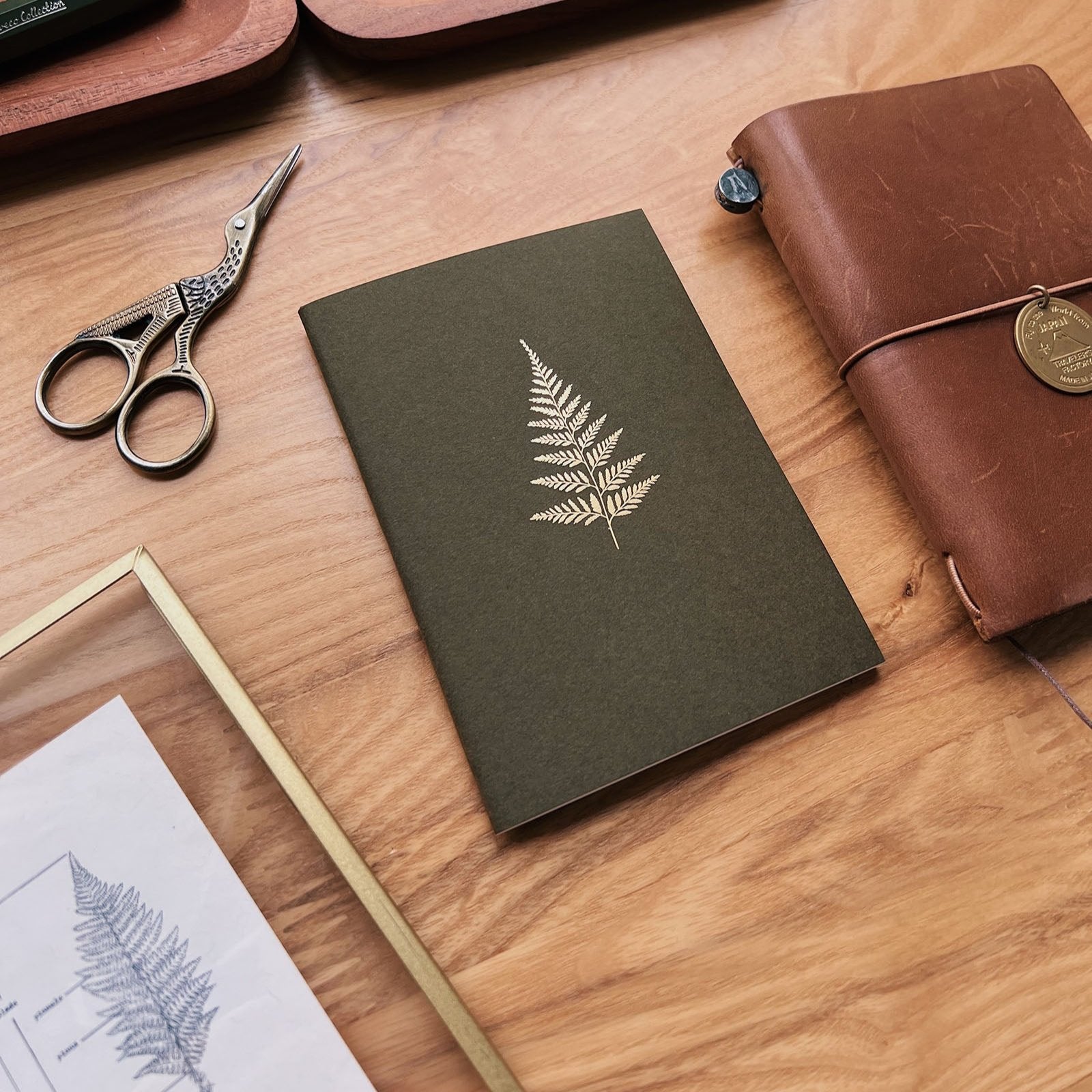 Sarica’s Fern notebook is filled with a hundred pages of subtly gridded Tomoe River Paper. The cream cover features a dainty gold debossed Fern design. Fits perfectly in a passport Traveler’s Notebook cover.