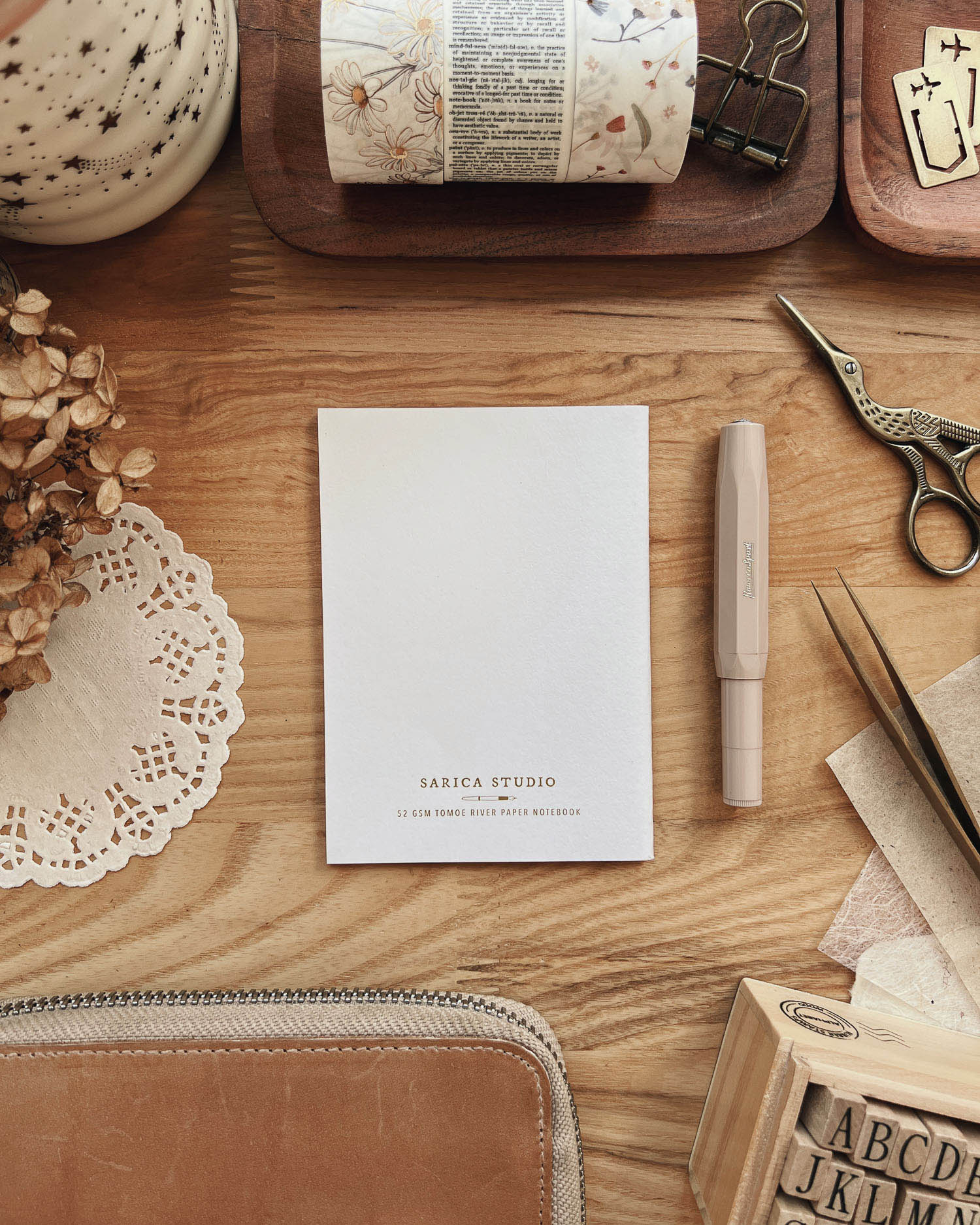 Sarica’s Lily notebook is filled with a hundred pages of subtly gridded Tomoe River Paper. The cream cover features a dainty gold debossed Lily design. Fits perfectly in a passport Traveler’s Notebook cover.