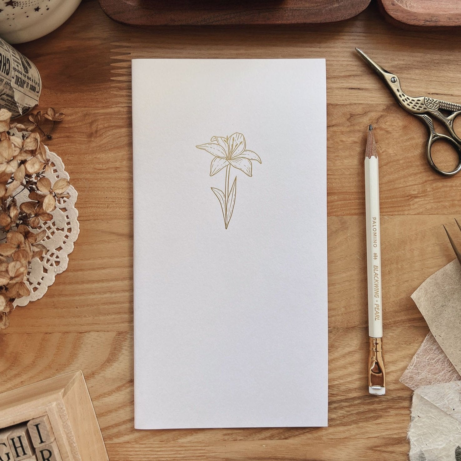 Sarica’s Lily notebook is filled with a hundred pages of subtly gridded Tomoe River Paper. The cream cover features a dainty gold debossed lily design. Fits perfectly in a standard Traveler’s Notebook cover.
