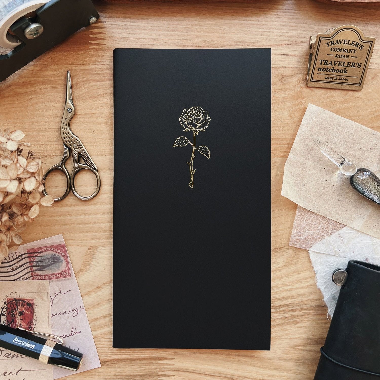 Sarica’s Rose notebook is filled with a hundred pages of subtly gridded Tomoe River Paper. The cream cover features a dainty gold debossed Rose design. Fits perfectly in a standard Traveler’s Notebook cover.